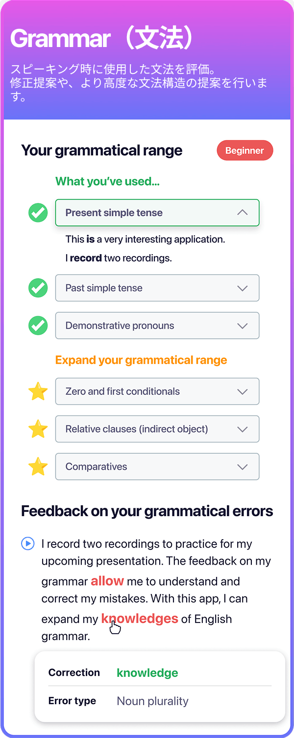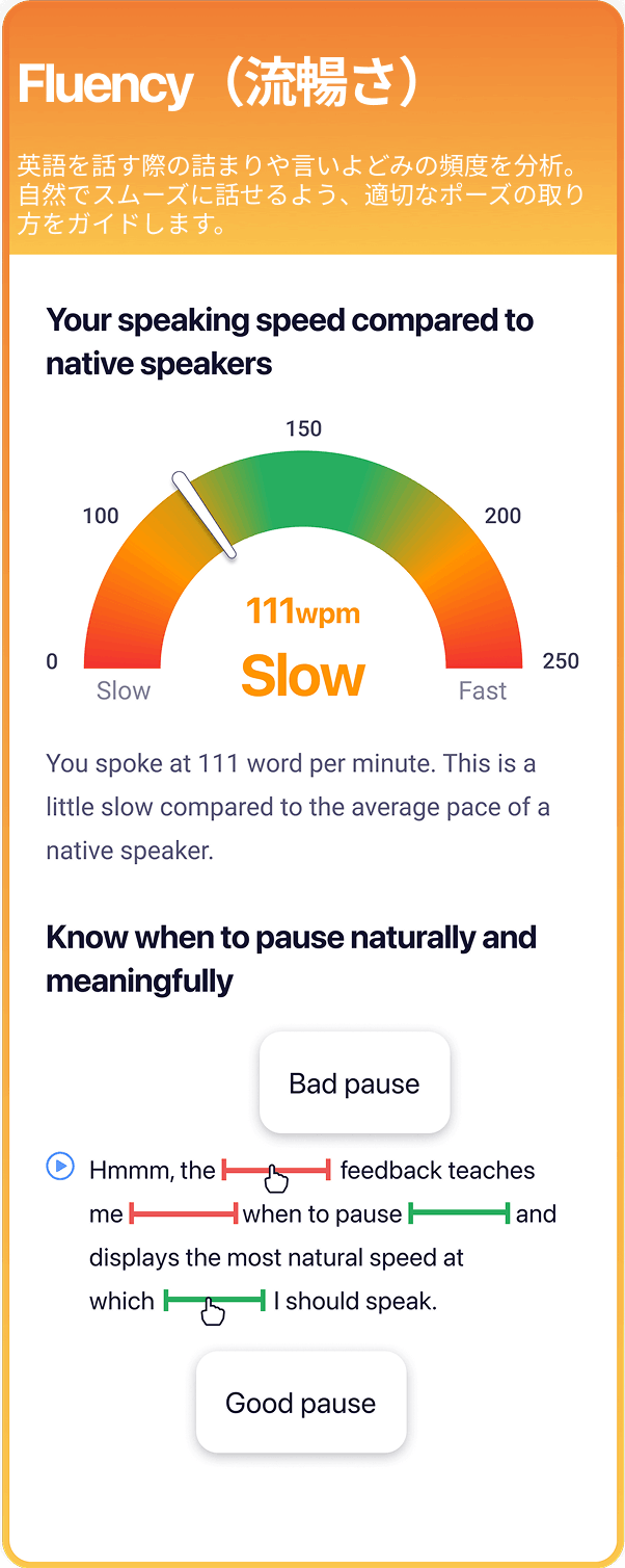 発音や流暢さをその場で分析する、詳細なリアルタイムフィードバック。