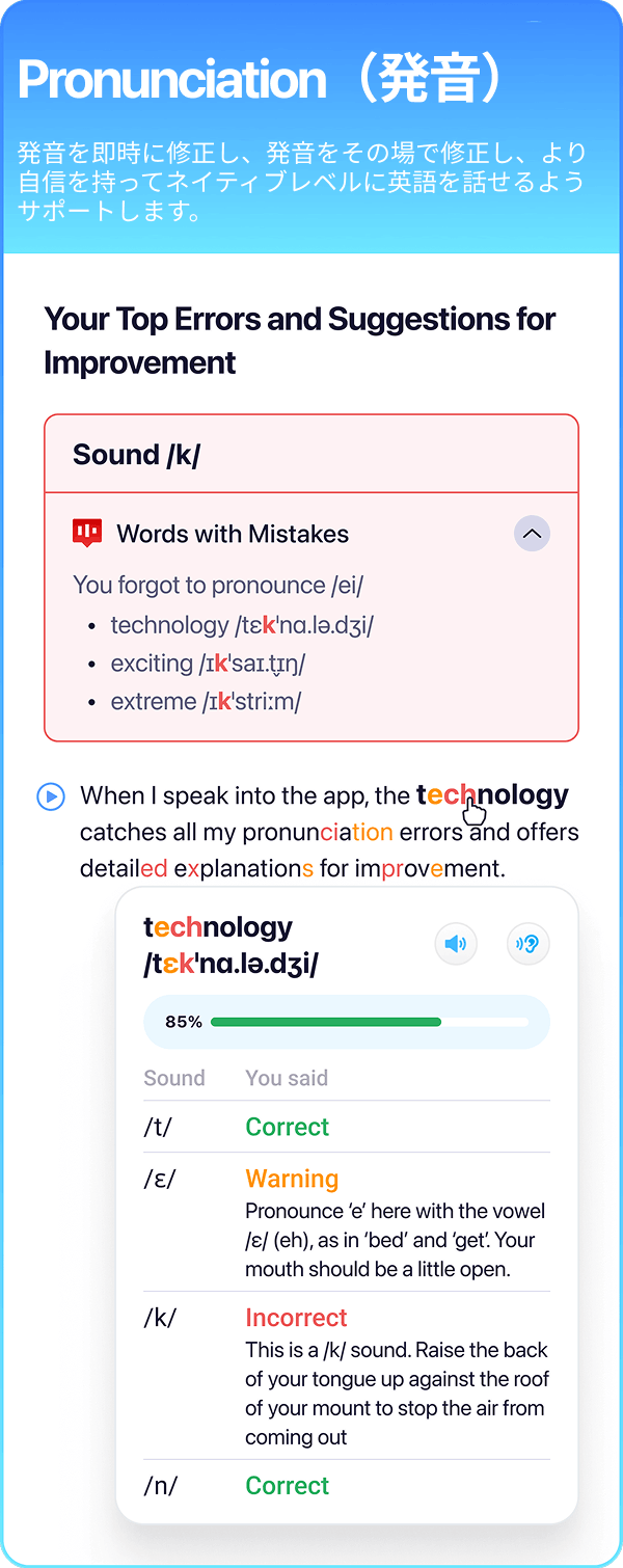 ネイティブレベルまでの詳細なリアルタイムフィードバックで、